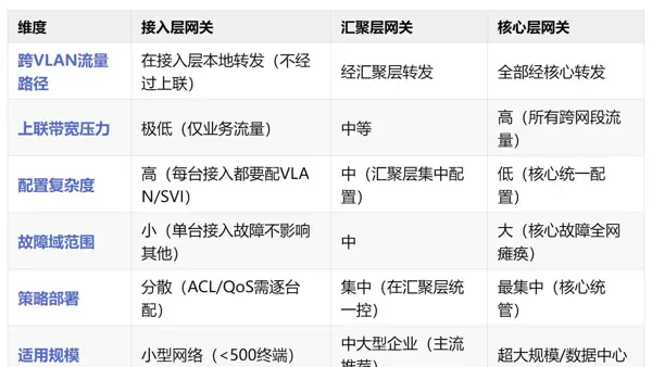 - 性能方面:若将网关置于接入层,虽可实现本地VLAN内快速响应,但跨VLAN流量可能频繁穿越多级设备,增加延迟;而集中式部署能统一调度,但对核心设备性能要求更高。