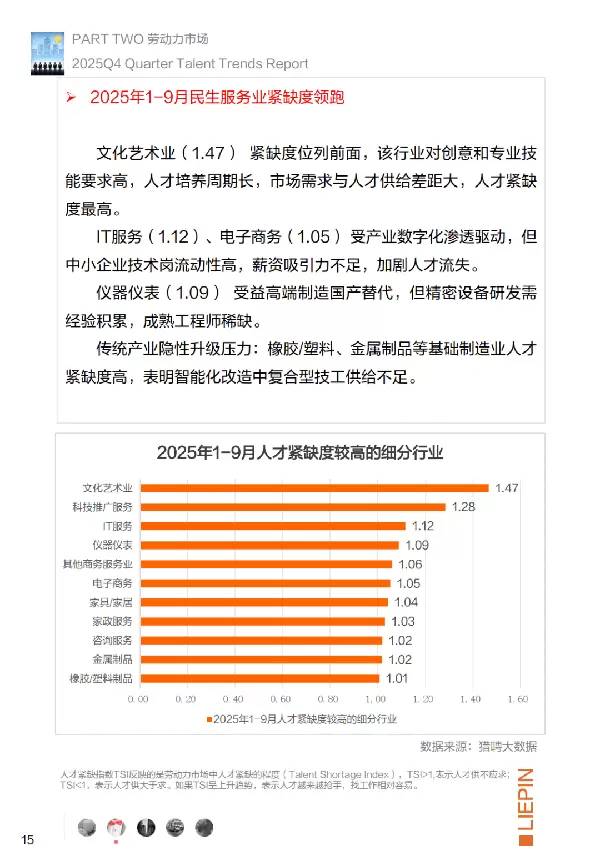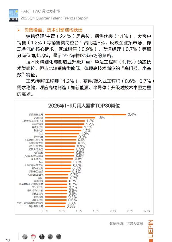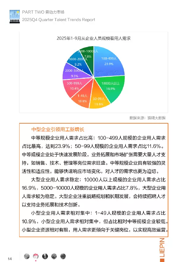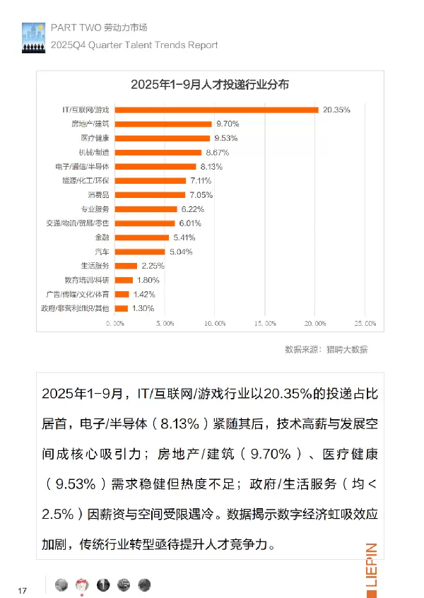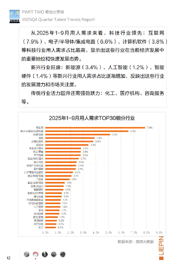 报告由猎聘大数据研究院发布,依托平台1.1亿注册用户、143万家认证企业数据及广泛的企业问卷调研,系统梳理了2025年第四季度劳动力市场的运行态势、招聘动向与企业用人策略。整体呈现出市场结构分化与技术要素驱动的双重特征。