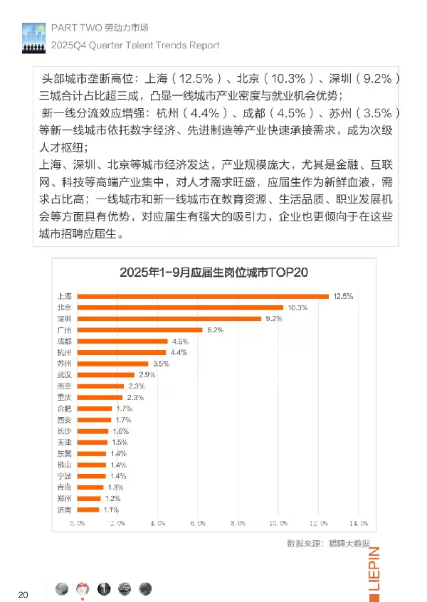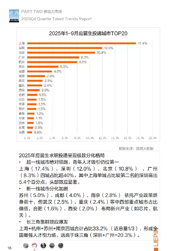 宏观经济方面,2025年前三季度国内生产总值同比增长5.2%,其中第三季度增速为4.8%。服务业和高技术制造业增长势头强劲,成为支撑就业市场的重要力量。劳动力市场需求呈现结构性集中:一线及新一线城市占据用工需求总量的72%以上,上海、深圳、北京位列城市需求榜前三;企业规模中,100至499人的中型企业贡献了23.9%的岗位需求,成为吸纳就业的主力群体;行业分布上,科技类领域占据主导地位,互联网、电子/半导体/集成电路、计算机软件等行业岗位供给领先,新能源、人工智能等新兴赛道人才需求持续扩张。
