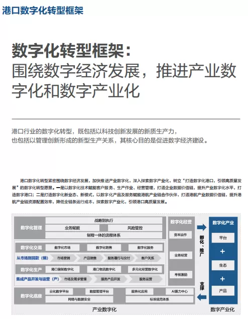 白皮书提出,港口数字化转型应紧扣数字经济发展脉络,统筹推进产业数字化与数字产业化进程,构建以“六个数字化”为核心的系统性蓝图——涵盖生产、交易、管理、经营、底座和产业六大维度,形成多维联动、协同支撑的整体架构。