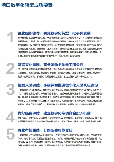 白皮书强调,港口数字化转型是一项复杂的系统工程,必须从组织架构、文化建设、人才储备、资金支持及考核机制五个方面建立支撑体系,确保各项举措落地见效。