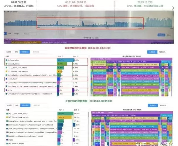 结合持续性能剖析所获取的 CPU 使用趋势,发现异常集中在 00:01:00 至 00:03:13 这两分钟内。由于故障持续时间极短,准确识别根因成为防止复发的关键。得益于 DeepFlow 的零侵扰、低开销持续剖析能力,系统完整记录了故障期间应用进程的 On-CPU 剖析数据。运维人员随即对比正常时段与异常时段的火焰图差异: