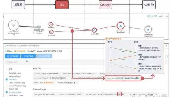 如上图所示,借助 DeepFlow 的流量拓扑功能可识别出 ELB 与 Gateway 之间的链路存在异常。深入查看流日志后发现,连接结束类型为“客户端重置”,此类问题通常由客户端(即 ELB)错误复用 SNAT 源端口所致。将此分析结果提交给私有云服务商后,对方快速调整了 ELB 的相关配置,问题随即消除。