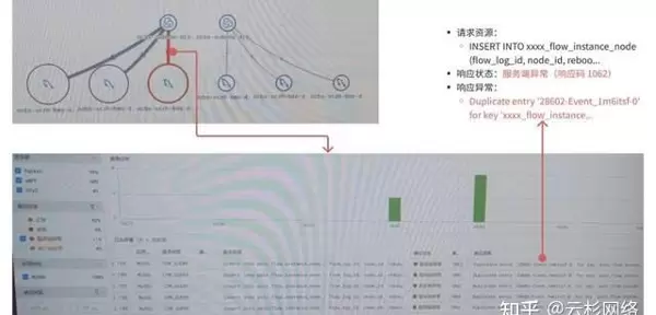 借助 DeepFlow 全栈观测平台对“压测机 → 网关 → 应用 → 数据库”整条链路的全覆盖能力,系统快速捕获到 ncbs-subnoa 访问数据库时的异常行为,并可进一步下钻查看具体的 SQL 错误码(1062)、错误描述(Duplicate entry)及对应的 SQL 语句(INSERT INTO xxxx_flow_instance_node)。这些精准的异常信息被反馈给开发团队后,问题得以迅速修复。