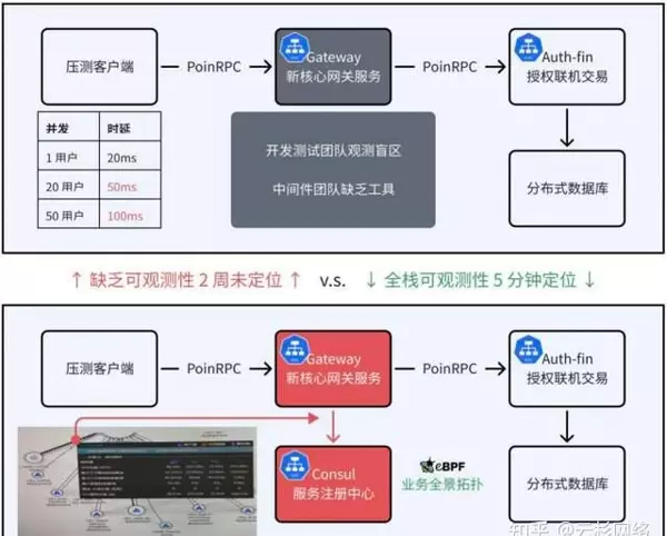 测试团队指出:理论上,网关不应成为性能短板,但由于缺乏对容器云、网络层及PointRPC框架的可观测能力,仅靠信用卡运维团队难以深入排查。在将DeepFlow接入该压测环境后,打开业务全景拓扑的瞬间即暴露出异常:新一代核心网关服务Gateway与服务注册中心Consul之间存在异常高频通信。该线索提交至新核心团队后,迅速确认问题根源——网关未实现本地缓存,每笔交易均需实时向Consul查询服务注册信息,导致高并发下资源耗尽,带宽打满,时延急剧上升。