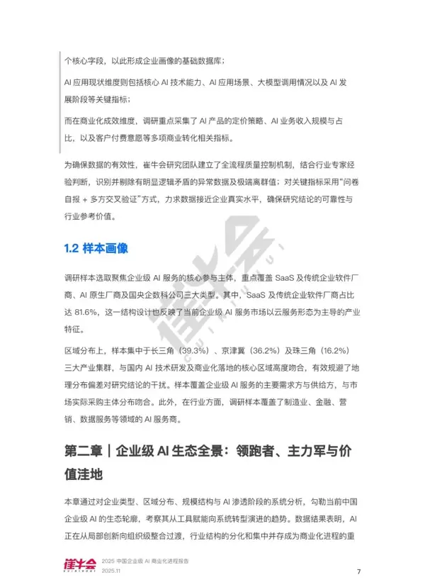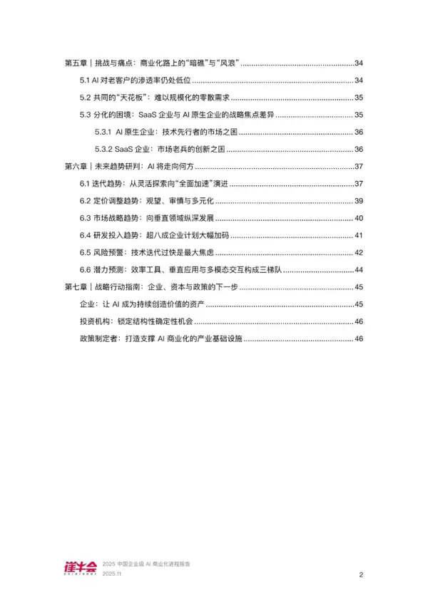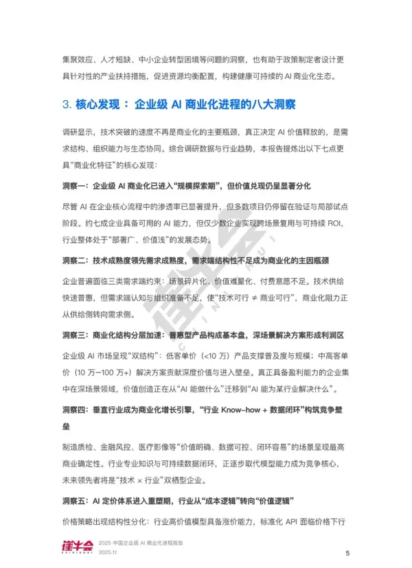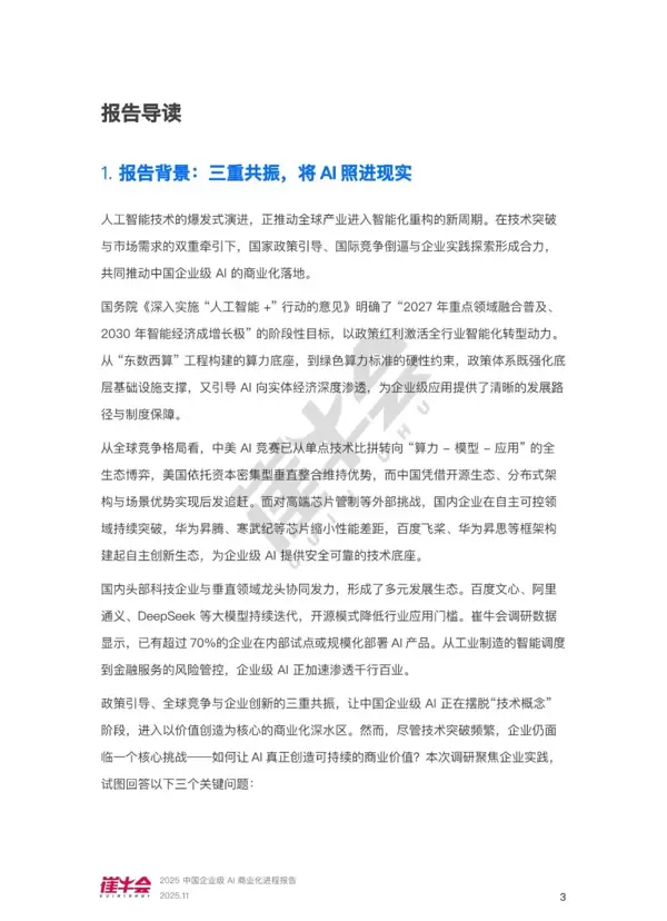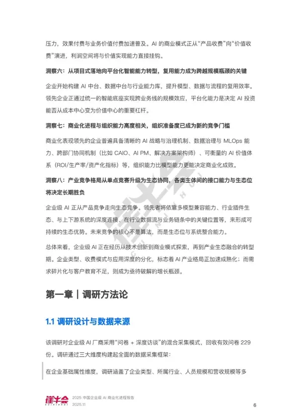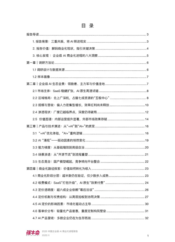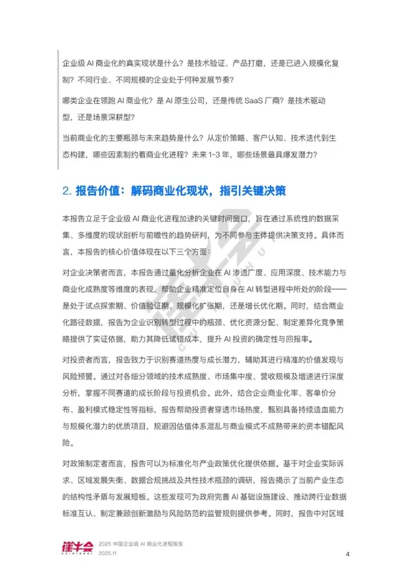 本报告聚焦于企业级AI商业化加速的关键节点,通过系统性数据采集、多维度现状分析以及前瞻性趋势预判,为各类参与方提供决策支持。其主要贡献体现在以下三个方面: