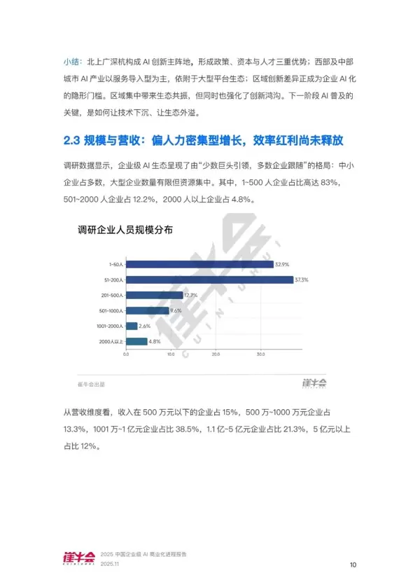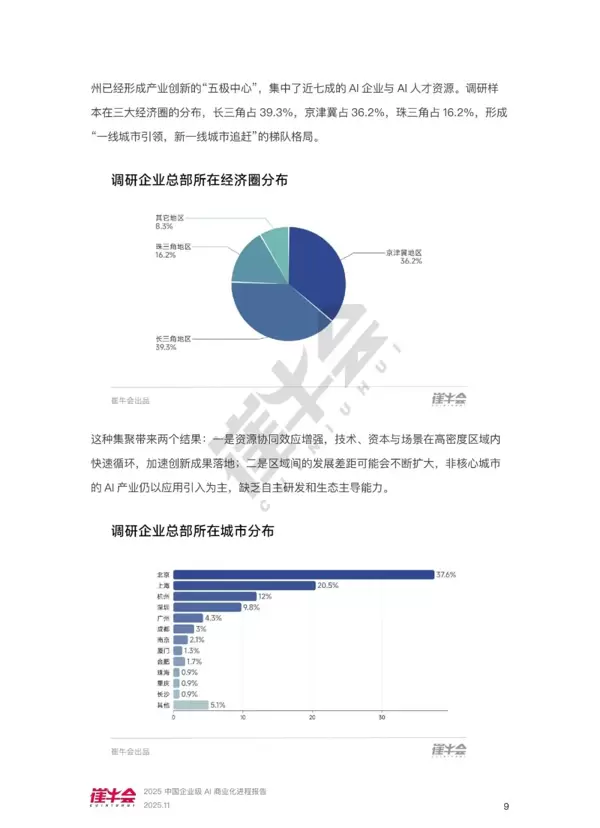 对于政策层面,报告依托对企业实际需求、区域发展不平衡、数据合规难题以及共性技术瓶颈的调研结果,揭示当前AI产业生态中存在的结构性矛盾与发展短板。这些洞察可为政府完善AI基础设施建设、推动跨行业数据标准互通、制定兼顾创新激励与风险防控的监管政策提供参考依据。此外,报告中关于区域集聚效应、人才供给不足、中小企业转型困难等问题的分析,也有助于设计更具针对性的扶持措施,促进资源合理流动,构建健康、可持续的AI商业生态环境。