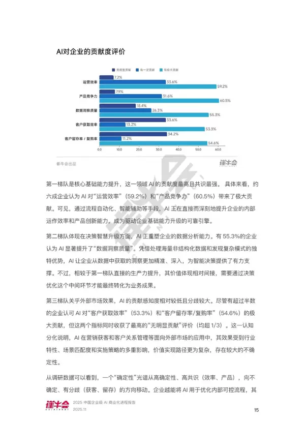 2025年,企业级AI的商业化进程显著提速,人工智能技术正逐步从实验室研究迈向实际市场应用,成为驱动企业数字化转型的重要引擎。调研数据显示,AI在企业中的应用已进入“规模化探索阶段”,但不同企业在价值实现方面仍存在较大差异。
