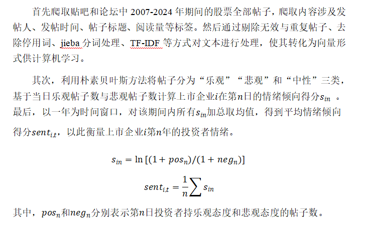 步骤一 数据获取:定向采集2007至2024年间财经网络社区(包括股票主题贴吧及行业论坛)发布的全部股票相关帖子,提取发帖人标识、发布时间、标题文本、阅读量等结构化信息。