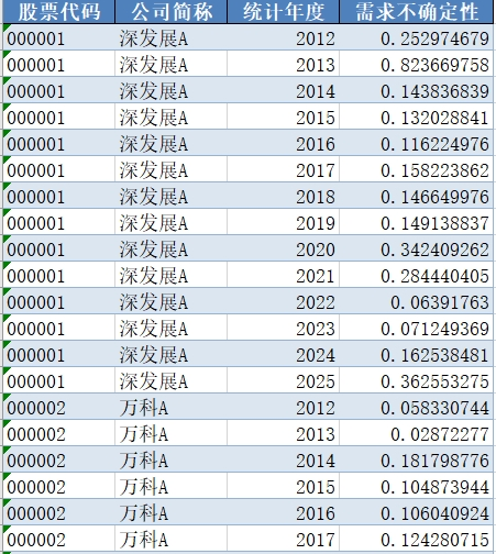 需求不确定性是企业每一期市场需求围绕其平均值波动的不可预测部分,该指标数据库的核心价值在于为实证研究提供了识别企业真实需求风险的量化基础。通过捕捉需求波动方差而非均值变动,使得该指标直接驱动了企业工业机器人应用决策,缓解了上行拥挤成本以及推动了配套管理的变革降低了库存水平与长期劳动负担,不仅验证了“技术—成本弹性”的理论机制,还为政策设计提供了微观证据。其动态连续性特征进一步支持了异质性分析(如数字化转型、供应链金融的调节效应),为理解智能制造转型的驱动因素及经济后果构建了关键实证桥梁。因此本数据参考黄家澜,李常青,赵立彬(2025)的做法,构建上市公司需求不确定性指标。