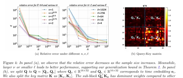 该研究提出了一种名为“扩散Transformer”的理论框架,将分数函数建模为梯度下降过程的迭代输出,并通过Transformer结构对这一过程进行展开。利用自注意力机制计算时间嵌入之间的相关性,有效捕捉高斯过程中存在的时空依赖关系。结合相关性截断与衰减特性对模型进行优化,在包含128个时间步的高斯过程数据上进行了验证,结果表明该方法能够精确还原真实的时空依赖结构。样本复杂度随数据量增长呈现1/√n的缩放趋势,且在使用soft-max和ReLU激活函数的情况下均表现出良好适应性。