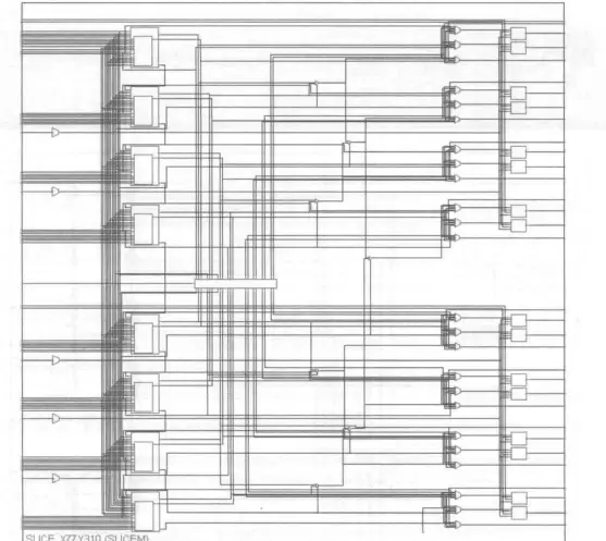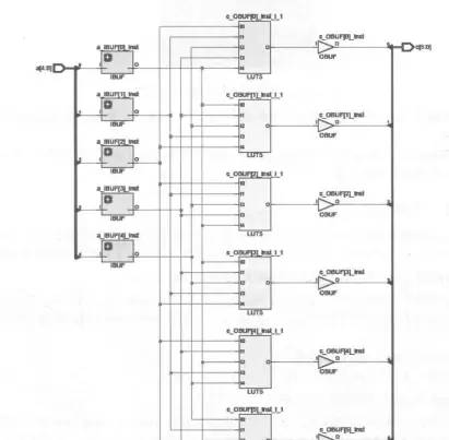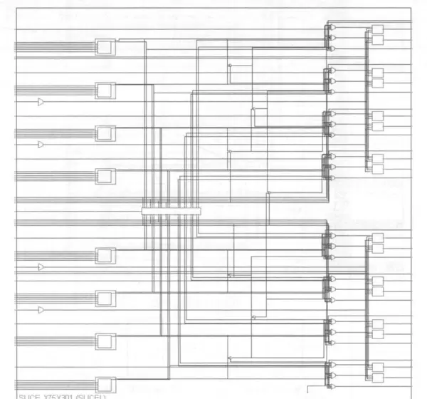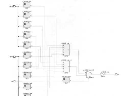 该设计在FPGA中综合后的结果如图所示,可见选择操作由查找表与多路复用器协同完成。