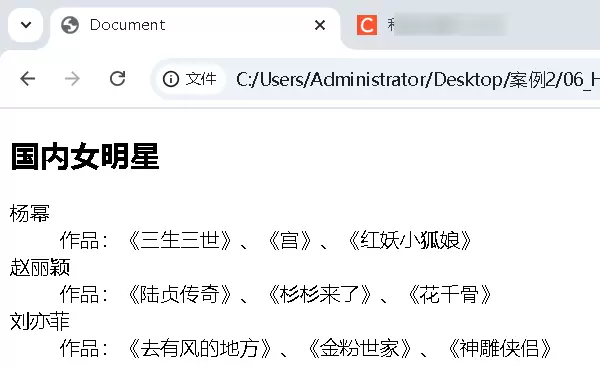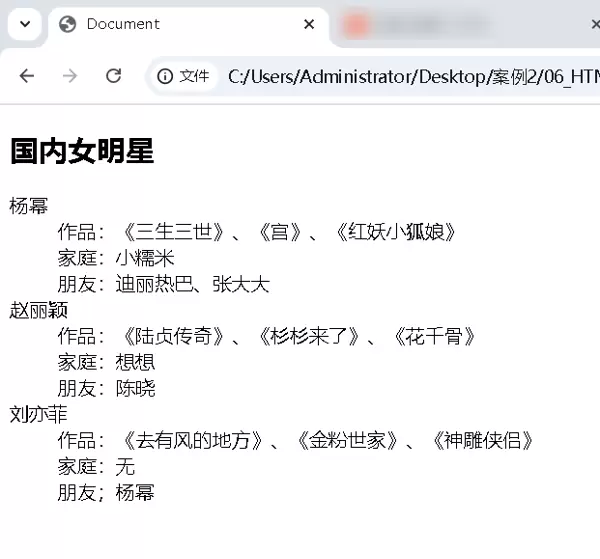 <h2>国内女明星</h2> <dl> <dt>杨幂</dt> <dd>作品:《三生三世》、《宫》、《红妖小狐娘》</dd> <dd>家庭:小糯米</dd> <dd>朋友:迪丽热巴、张大大</dd> <dt>赵丽颖</dt> <dd>作品:《陆贞传奇》、《杉杉来了》、《花千骨》</dd> <dd>家庭:想想</dd> <dd>朋友:陈晓</dd> <dt>刘亦菲</dt> <dd>作品:《去有风的地方》、《金粉世家》、《神雕侠侣》</dd> <dd>家庭:无</dd> <dd>朋友;杨幂</dd> </dl>