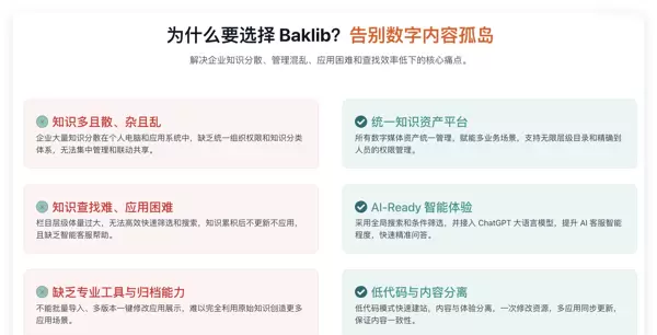 Baklib 通过深度融合 AI 生成、AI 搜索以及 AI 工作流技术,助力企业真正打造具备“智能服务中心”能力的运营体系,使内容、服务与业务流程都拥有持续自学习的能力。