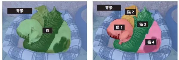 语义分割将每个像素按其所属的语义类别进行标记,例如“猫”。如果图像中出现多只猫,所有与猫相关的像素都会被统一归类为“猫”,不会区分个体。如图9-2所示,这是一种基于类别的像素级分类方法。