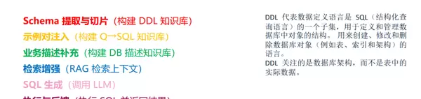 操作说明:从数据库的 DDL 语句(如 CREATE TABLE 等建表语句)中提取出完整的 Schema 信息,包括表名、字段名、字段类型、主外键关系等,并根据语义或结构进行合理切分(如按表拆分、按功能归类)。 目的意义:建立数据库的“结构化知识底座”,帮助系统准确理解数据组织方式,是后续生成正确 SQL 的前提条件。例如明确知道“订单表”包含“订单金额”字段及其数据类型。 关联说明:DDL 是定义数据库物理结构的语言,本步骤正是将其转化为机器可读、可推理的知识表示形式。 对应图示:CREATE TABLE