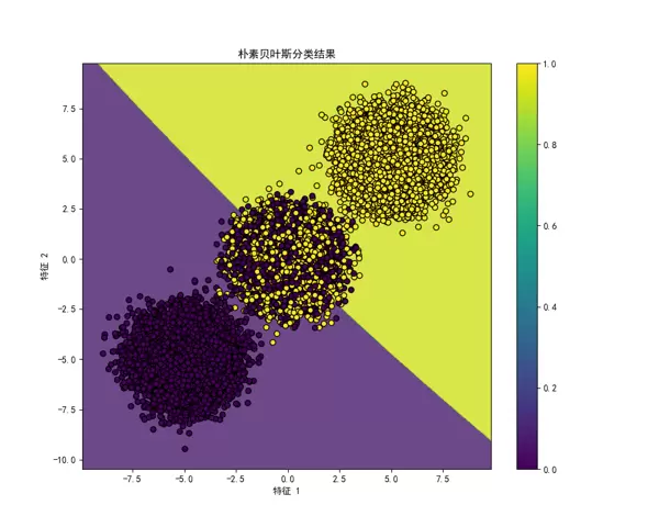 def visualize_results(X, y, clf, title="朴素贝叶斯分类结果"): # 配置 matplotlib 支持中文显示 plt.rcParams['font.sans-serif'] = ['SimHei'] # 使用黑体显示中文 plt.rcParams['axes.unicode_minus'] = False # 解决负号显示异常问题 # 设置网格分辨率 h = 0.02 # 计算特征空间范围 x_min, x_max = X[:, 0].min() - 1, X[:, 0].max() + 1 y_min, y_max = X[:, 1].min() - 1, X[:, 1].max() + 1 # 构建网格点阵 xx, yy = np.meshgrid(np.arange(x_min, x_max, h), np.arange(y_min, y_max, h)) # 对每个网格点进行类别预测 Z = clf.predict(np.c_[xx.ravel(), yy.ravel()]) Z = Z.reshape(xx.shape) # 创建图像并绘制可视化内容 plt.figure(figsize=(10, 8)) # 填充决策区域 plt.contourf(xx, yy, Z, alpha=0.8) # 绘制实际样本点 plt.scatter(X[:, 0], X[:, 1], c=y, edgecolors='k', marker='o') # 添加坐标轴标签和标题 plt.xlabel('特征 1') plt.ylabel('特征 2') plt.title(title) # 显示颜色图例 plt.colorbar() # 保存图像文件 plt.savefig("朴素贝叶斯分类结果.png") # 关闭当前绘图以释放内存 plt.close()该函数主要完成以下操作: