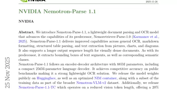 从本质上讲,Nemotron-Parse 1.1的价值在于它实现了高性能与轻量化之间的良好平衡。尽管参数量仅为8.85亿,却能完成以往依赖数十亿参数模型才能胜任的复杂文档解析任务。这种效率上的突破不仅减少了对计算资源的消耗,也使得先进技术更易于部署和推广。通过创新的架构设计、高效的训练策略以及精细的工程优化,研发团队成功打造了一个兼具实用性与可扩展性的文档理解工具。无论面向大规模文档处理的企业用户,还是希望嵌入解析功能的开发人员,该模型都提供了一种高效且易用的解决方案。随着应用边界的不断拓展,这项技术有望在未来的数字化进程中扮演愈发重要的角色。