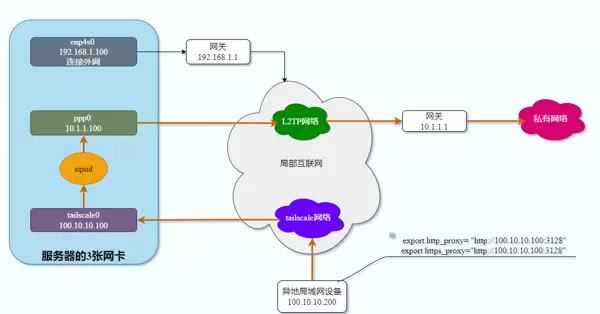 Tailscale —— 构建虚拟专用网络(VPC) 功能:将分布于各地的设备无缝组建成一个加密的虚拟局域网 优势:自动发现节点、端到端加密、零配置连接 L2TP隧道 —— 建立通往总部的安全链路 用途:由网关设备发起,创建一条基于IPsec保护的稳定通道 特性:权限受限,仅允许授权设备建立连接 Squid代理服务 —— 实现请求中转与流量代理 职责:接收来自Tailscale网络内其他设备的HTTP/HTTPS请求,并通过L2TP通道代为转发至目标网络 类比理解:如同快递集散中心,将普通运输路线的包裹转入专用高速通道进行投递三、运行机制详解