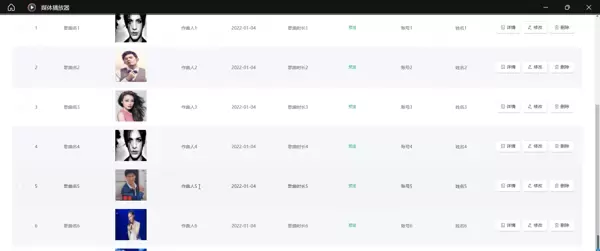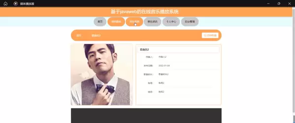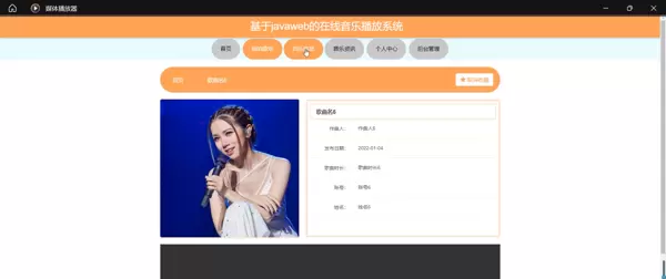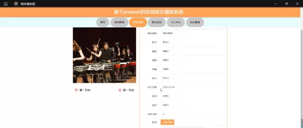 音乐信息展示模块:呈现每首音乐的详细信息,包括标题、歌手、专辑、时长、封面图像等,并支持在线播放与收藏功能。所有音乐数据由后台统一维护,确保信息准确性和一致性。