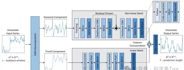 - 非线性流(CNN):负责建模季节性分量,融合patch划分与深度可分离卷积,有效捕捉局部patch内的模式以及跨patch的时空相关性。