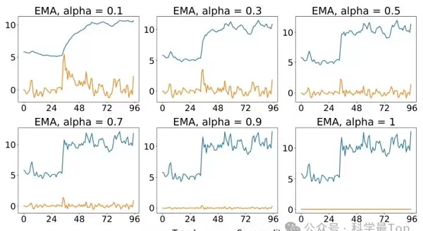 如上图所示,在ETTh1数据集上,研究人员测试了不同平滑因子(0.1、0.3、0.5、0.7、0.9和1)对长度为96的样本进行分解的效果。结果显示:当平滑因子较小时,趋势分量更加平滑,对短期波动不敏感,对应的季节性分量包含更多高频信息;随着平滑因子增大,趋势更贴近原始序列,响应速度加快,季节性波动幅度相应减弱。