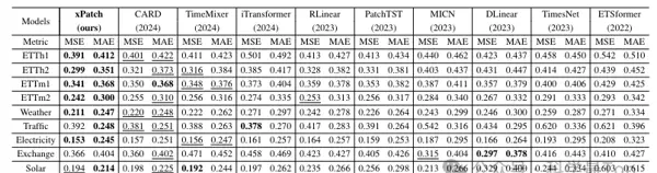 结果表明,xPatch在60%的测试案例中取得了最低MSE,在70%的情况下实现了最优MAE表现。相比CARD模型,MSE和MAE分别平均提升2.46%和2.34%;经过超参数搜索后,性能增益进一步扩大至5.29%(MSE)和3.81%(MAE)。