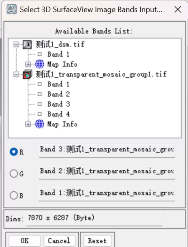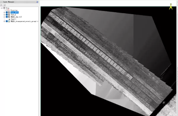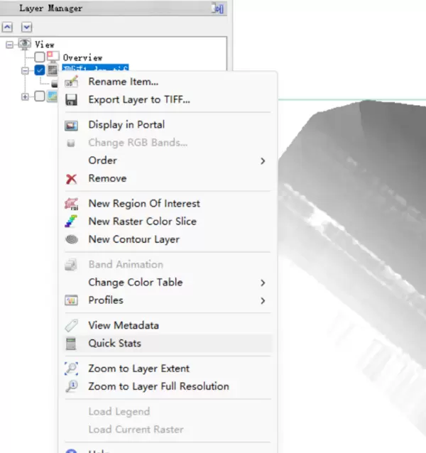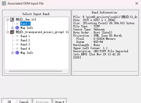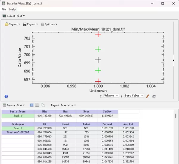 在数据准备阶段,需将 Pix4Dmapper 生成的多波段正射影像与 DSM(数字表面模型)文件导入 ENVI 软件。通过“Layer Manager”中的“Quick Stats”功能可快速获取 DSM 的高程统计信息。本次实验中,DSM 数据显示区域最小高程为 696.733398 米,最大值为 702.498291 米,该范围为后续三维建模提供了关键的高程参数依据。