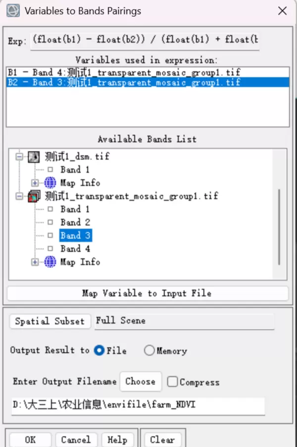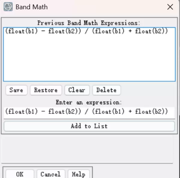 - 公式输入准确性:在 ENVI 的 Band Math 模块中,必须准确映射各波段并正确编写表达式。例如,在 NDVI 计算中需明确区分近红外与红波段,防止混淆;同时应使用 float 类型参与运算,避免整型截断造成精度损失。