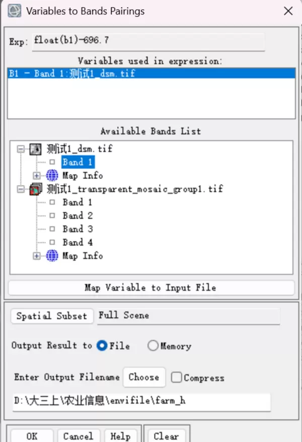 作物高度反演:作物高度是衡量其生长状态的重要指标,广泛应用于产量预测与长势监测等农业遥感领域。其基本原理是利用 DSM 与地面高程(DEM)之间的差值计算冠层高度模型(CHM),即:作物冠层高度 = DSM - DEM。由于本实验未获取独立的 DEM 数据,因此采用 DSM 与区域内最低高程(696.7 米)之差进行近似替代。在 ENVI 中使用“Band Math”工具输入表达式 “float(b1) - 696.7”(其中 b1 表示 DSM 数据),生成 CHM 结果图层,实现对作物相对高度的反演。