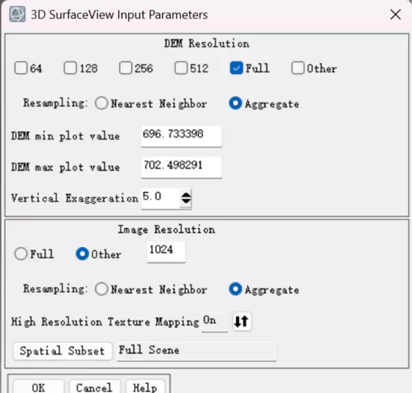 进入三维模型构建环节,在 ENVI 的 “Toolbox” 中选择 “3D → Terrain/3D SurfaceView” 工具,分别加载多波段影像的 RGB 波段作为纹理贴图数据,并以 DSM 作为高程源数据。设置 DEM 分辨率为 256,垂直夸张系数(Vertical Exaggeration)设为 5.0,图像分辨率调整至 1024,并勾选“High Resolution Texture Mapping”选项以增强模型表面纹理的清晰度。运行处理后即可生成具备真实感的三维实景模型,能够清晰展示研究区内的地形起伏特征及作物分布格局。