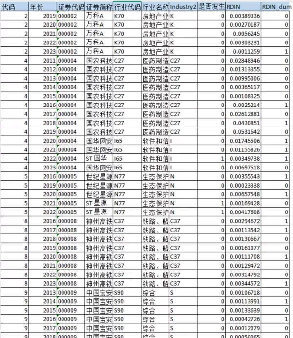 本数据集借鉴《财会月刊》苑泽明(2020)的研究方法,将研发操纵视为一种负向的真实盈余管理行为,并据此构建衡量指标。具体而言,当企业的异常研发支出(ABRD)大于0时,定义为存在研发操纵行为,此时将虚拟变量RDIN_dum赋值为1;否则为0。其中,TA表示企业总资产,RD代表实际研发支出,MV为企业市值的对数值,TBQ为企业托宾Q值,INT为营业利润,NMRD是通过模型估算出的正常研发支出水平,ABRD即为实际与预期之间的差额,反映研发操纵程度。