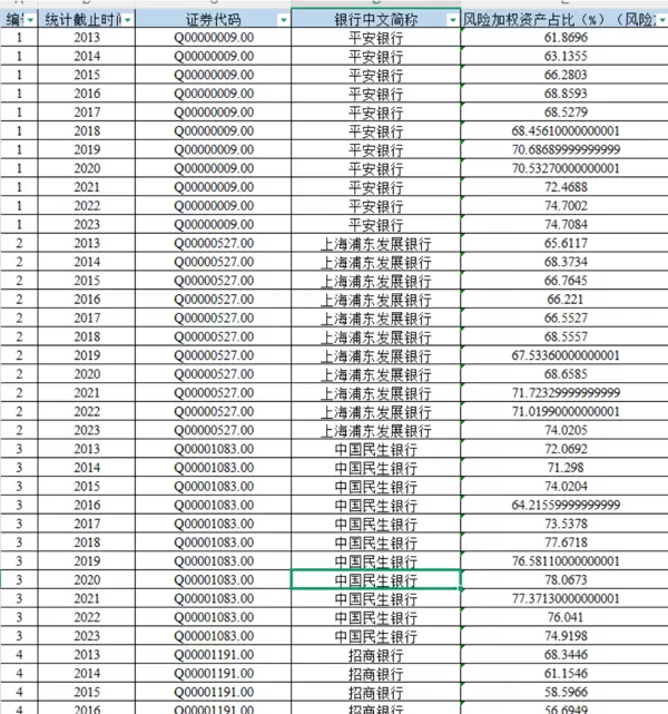 包含的主要变量有:编号、统计截止时间、证券代码、银行中文简称、风险加权资产占比(%)、以及风险加权资产与总资产的比值(即风险加权资产/总资产)。