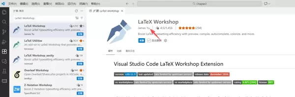 在搜索栏中查找由James Yu开发的LaTeX Workshop插件,并完成安装。