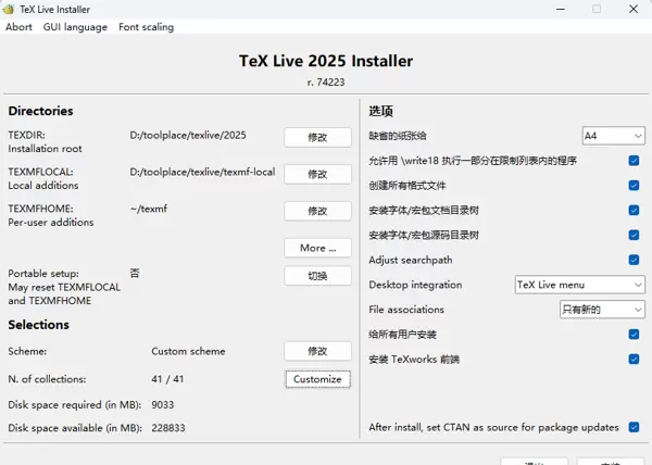 - 组件选择:确认“N. of collections”显示所有项目均被选中,确保安装完整的TeX Live套件,防止后期因缺少宏包而报错。