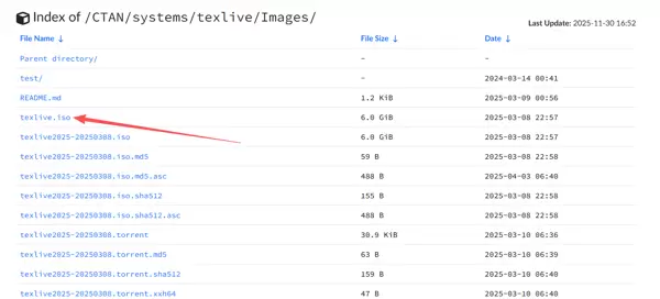 - ISO镜像文件:推荐使用此方法。建议从CTAN的国内镜像站点(例如清华大学开源软件镜像站)下载完整ISO镜像(约6GB),避免网络波动影响安装进度。