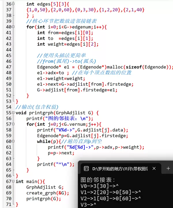 整个实现依赖三个关键结构体:- 边表节点(Edgenode):用于表示一条出边,包含目标顶点下标(adx)、边的权重(weight),以及指向下一个边节点的指针(next),构成链式结构的基本单元。