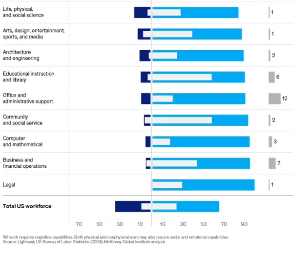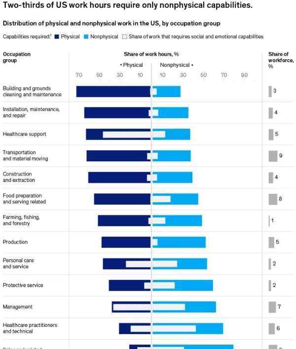 目前,美国三分之二的工作时间集中在非物理领域。其中,三分之一高度依赖社会与情感能力——例如教师的教学引导、护士的情感抚慰、管理者的团队激励——这些仍是AI难以复制的人类优势区。