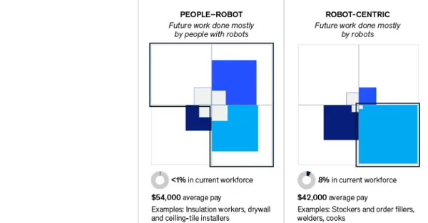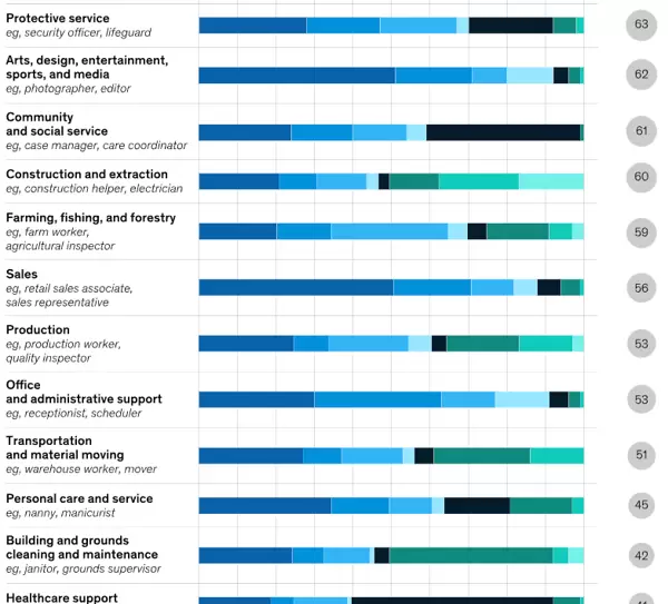 位于最左侧的是以人为中心的职业,约占总岗位的33%,平均年薪达71,000美元。这类角色常见于医疗护理、建筑维修等领域。无论技术如何进步,病床前的关怀、管道井中的灵活检修,依然离不开人的亲临现场与经验判断。这类岗位不仅相对稳定,还可能因稀缺性而进一步升值。