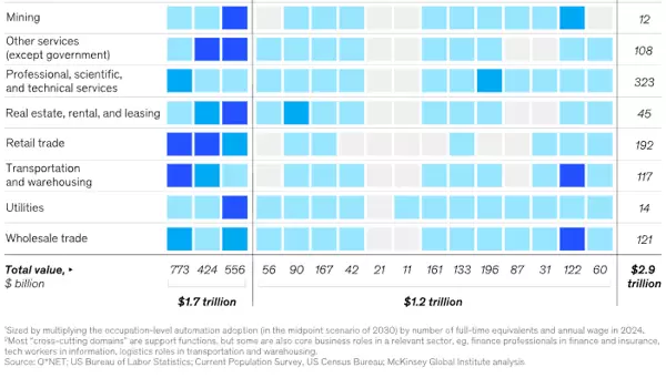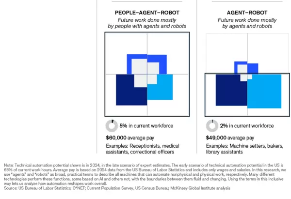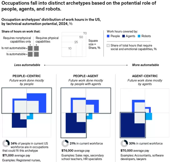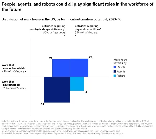 因此,这57%并非意味着岗位消失,而是预示着工作内容的重构。随着智能体和机器人承担起重复性任务,人类得以释放精力,专注于更高价值的活动。若能在2030年前有效重塑人机协作模式,美国每年有望创造高达2.9万亿美元的新增经济价值。