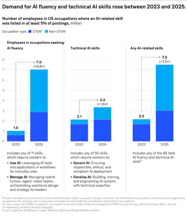 与此同时,一种全新的关键能力正迅速崛起——AI流利度(AI Fluency)。过去两年中,美国招聘信息里对该能力的需求激增七倍,增速远超其他任何技能。这种要求并不仅限于会写Python代码或使用ChatGPT生成文案,而是指具备理解AI、有效运用AI、管理AI系统,并对其输出结果进行批判性评估的能力。