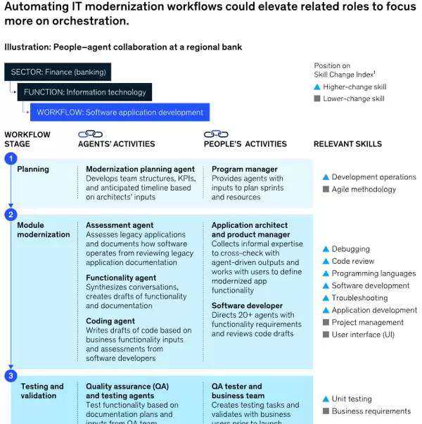 一家区域性银行尝试由AI智能体承担此项任务。首先,评估型智能体扫描陈旧代码库,梳理模块间的依赖关系;接着,功能设计智能体规划新的系统架构;最后,编码智能体负责将原有代码翻译成现代语言,并自动执行测试流程。