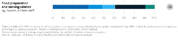 预计到2030年,在技术采用的中性情景下,最热门的100项技能中,约有四分之一到三分之一的工作时间将实现自动化。如果技术发展更快,这一比例还将上升。值得注意的是,约72%的技能具有跨界属性,