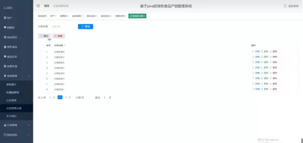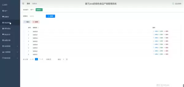当管理员点击绿色食品模块时,系统跳转至绿色食品管理页面。在此页面中,可通过填写食品名称、食品类型、销售地、种植地、价格等条件进行查询,并可执行新增、删除绿色食品记录的操作,同时提供详情查看、信息更新、评论查阅等功能。