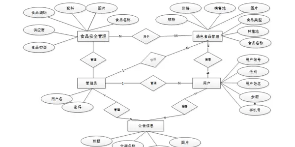 本系统采用实体-关系模型(E-R图)来描述各主要实体之间的关联关系。关键实体包括“用户”、“管理员”、“绿色食品”、“食品安全”以及“公告信息”等。这些实体及其相互联系构成了系统的数据逻辑框架,具体展示于图4-2中。
