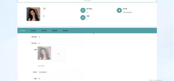 个人中心页面集成了多个用户专属功能模块,包括个人信息维护、密码修改、订单管理、收货地址设置及收藏夹查看等。用户可在该界面完成对自身数据的全面管理。页面布局与功能分布如图5-6所示。