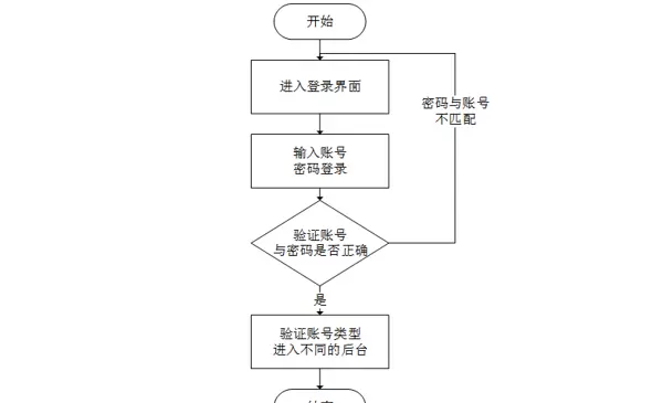 登录流程中,用户输入账号与密码后,系统验证其正确性。若凭证有效,则根据账号类型跳转至对应的管理后台界面;若验证失败,则返回登录页面重新输入,直至通过验证为止。