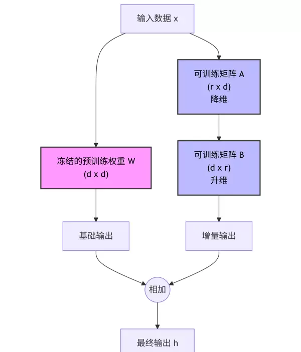技术思想:假设权重变化矩阵具有低秩特性。不直接修改原始大矩阵 W,而是引入两个小型可训练矩阵 A 和 B 进行增量调整。