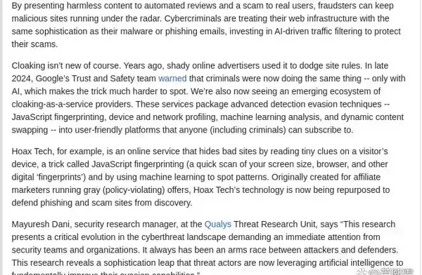 CaaS的核心在于实现“选择性内容呈现”:当访问请求来自自动化安全探测系统(如Google Safe Browsing爬虫、企业级沙箱环境或威胁情报采集节点)时,服务器响应为合法合规的网页内容;而一旦判定访问者为真实人类用户(特别是目标组织员工),则立即加载完整的钓鱼表单或执行恶意脚本。虽然此类策略并非全新概念——早期黑帽SEO曾利用User-Agent字符串或IP地址进行粗粒度分流——但现代CaaS已借助JavaScript设备指纹、Canvas渲染差异、TLS握手特征、鼠标移动轨迹等高维行为数据,结合轻量级机器学习模型,实现了远超传统规则匹配的精准判别能力。