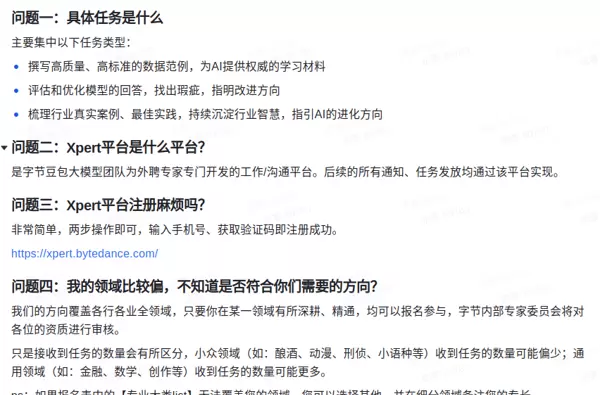 Xpert 是由字节跳动旗下大模型团队专为外部合作专家打造的一个任务对接与沟通协作平台。成功加入后,用户可通过该平台领取并完成相关任务。